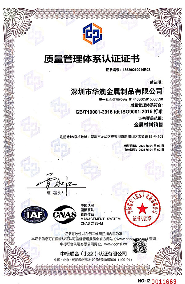 深圳市華澳金屬制品有限公司成立于2011年,擁有20多人的研發(fā)團(tuán)隊(duì),10+年專(zhuān)注金屬原材料生產(chǎn)經(jīng)驗(yàn),主打產(chǎn)品系列包含:鋁合金系列、不銹鋼系列、鈦合金系列,并通過(guò)ISO質(zhì)量管理體系認(rèn)證9001:2015,產(chǎn)品符合“SGS"、"RoHS"環(huán)保認(rèn)證。